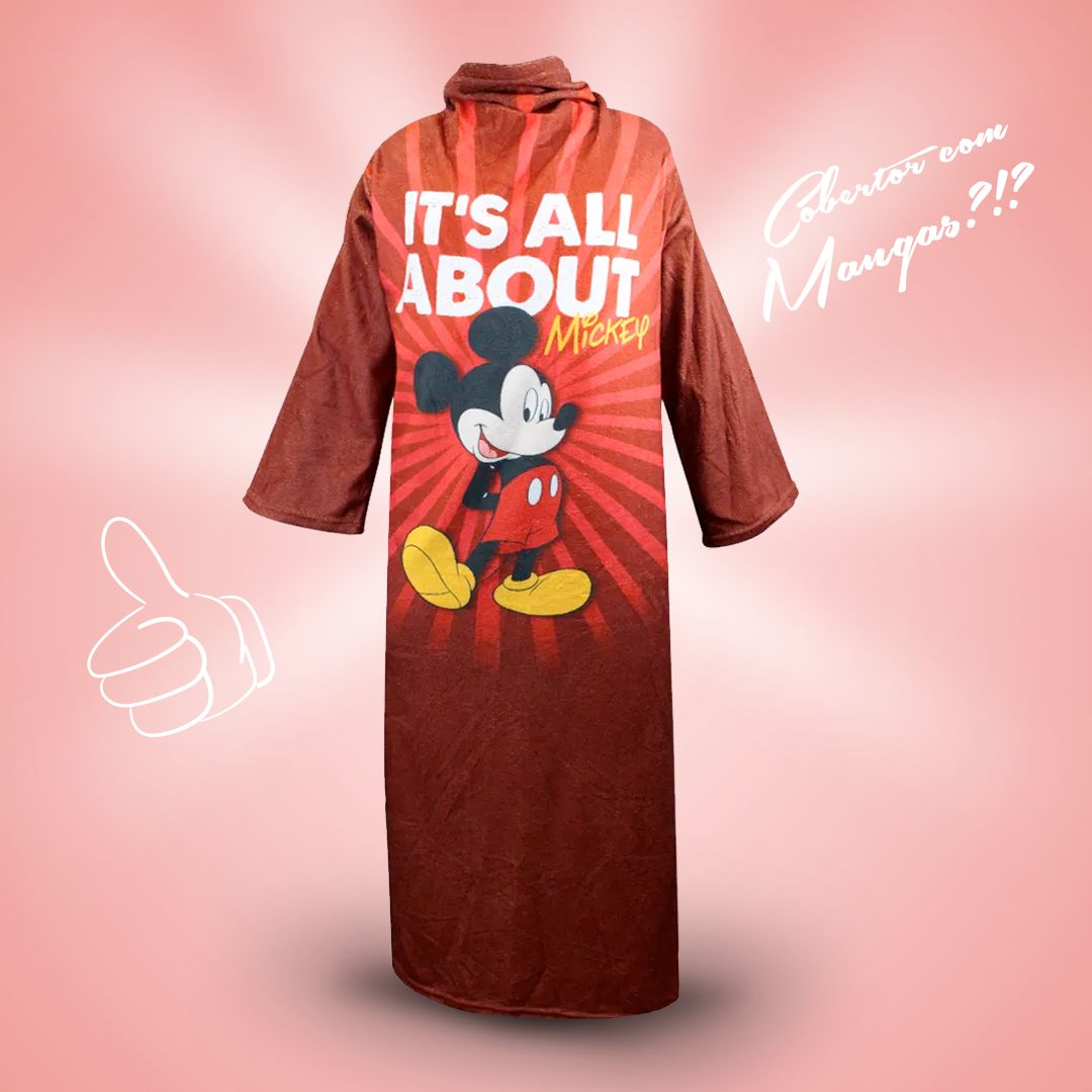 Sim, e ainda vem com o personagem mais querido do mundo? Ah, este cobertor de mangas Mickey é perfeito para ficar coberto sem perder os movimentos, dá pra sonhar confortavelmente dentro dele.